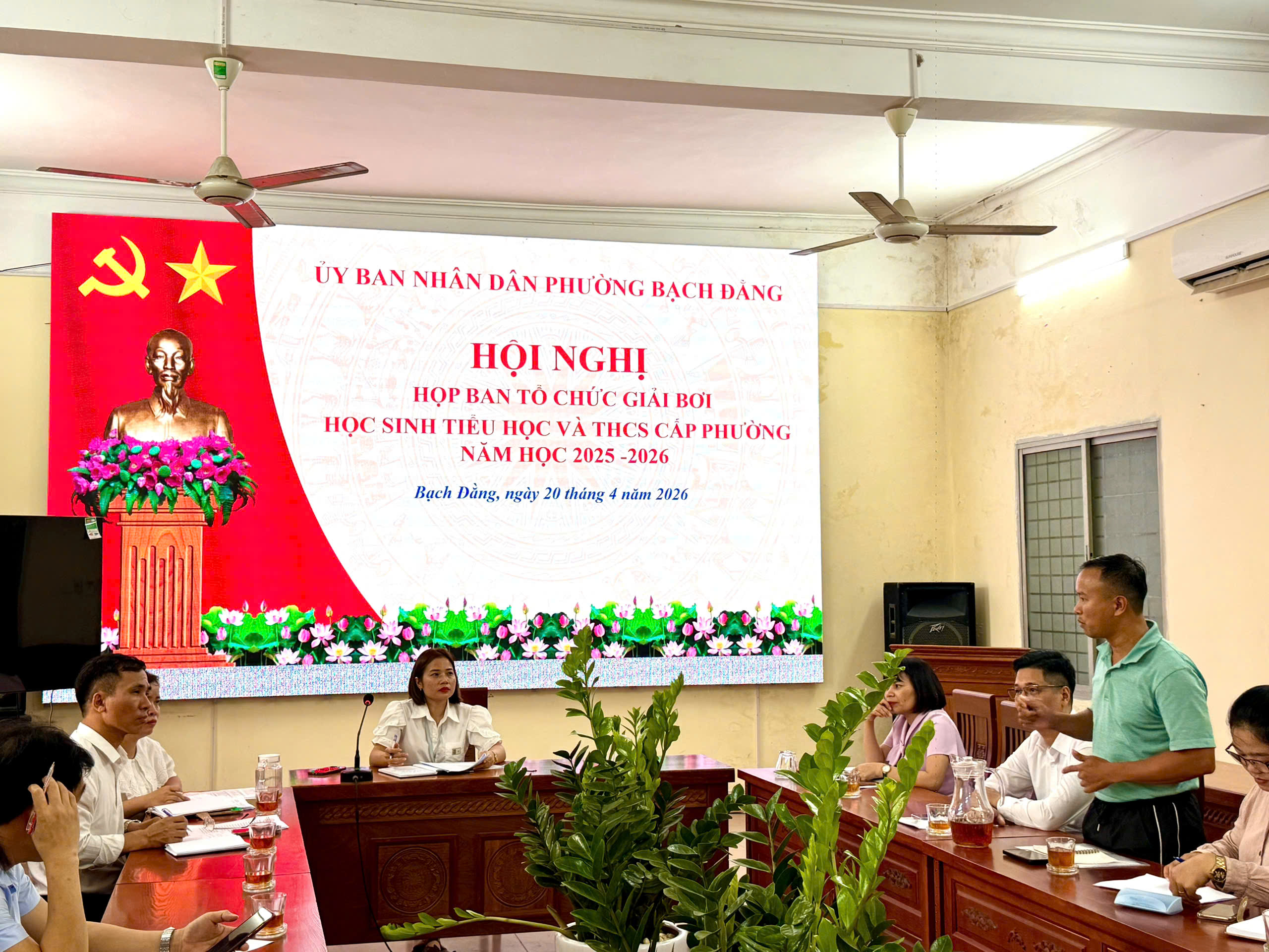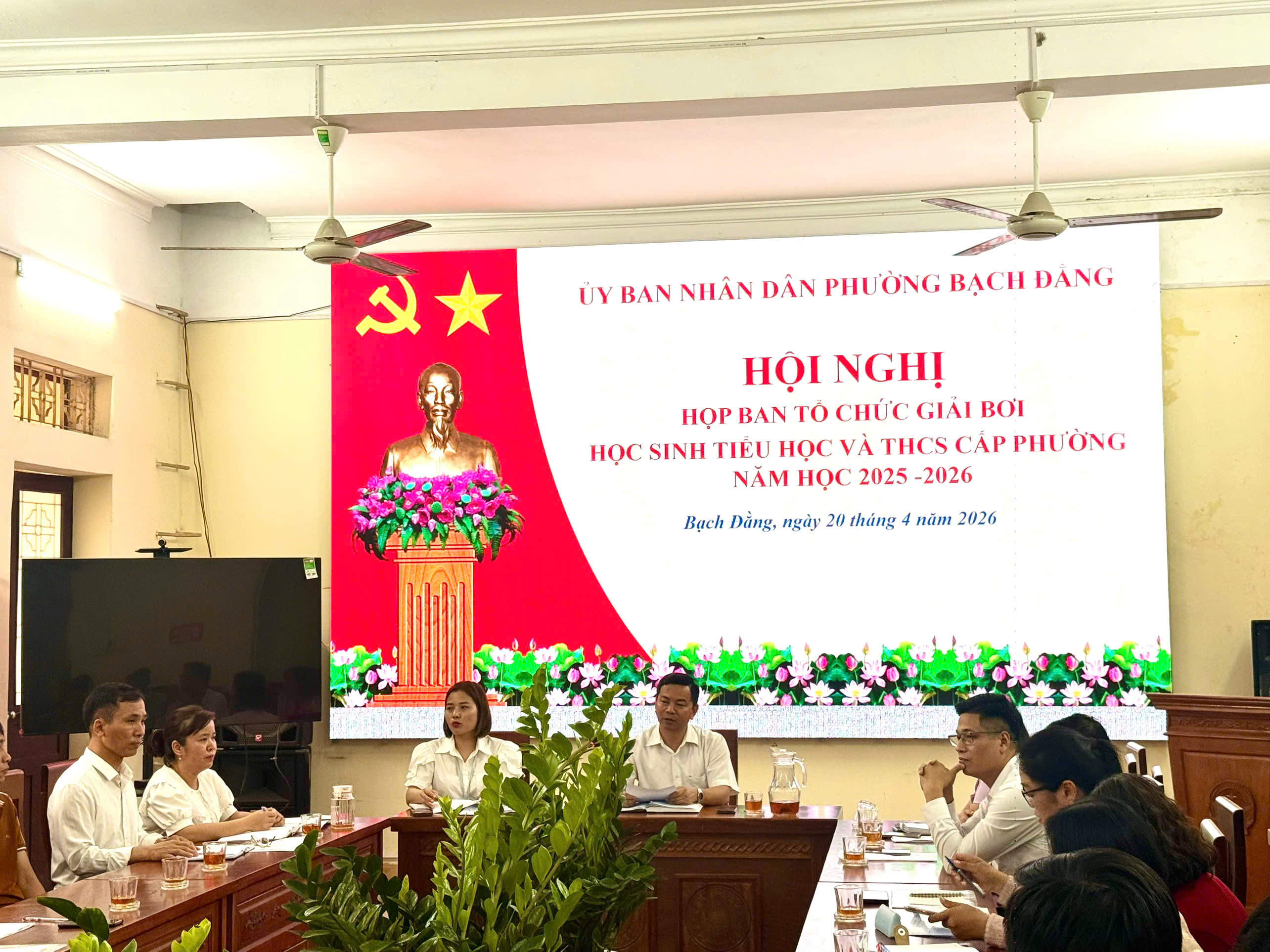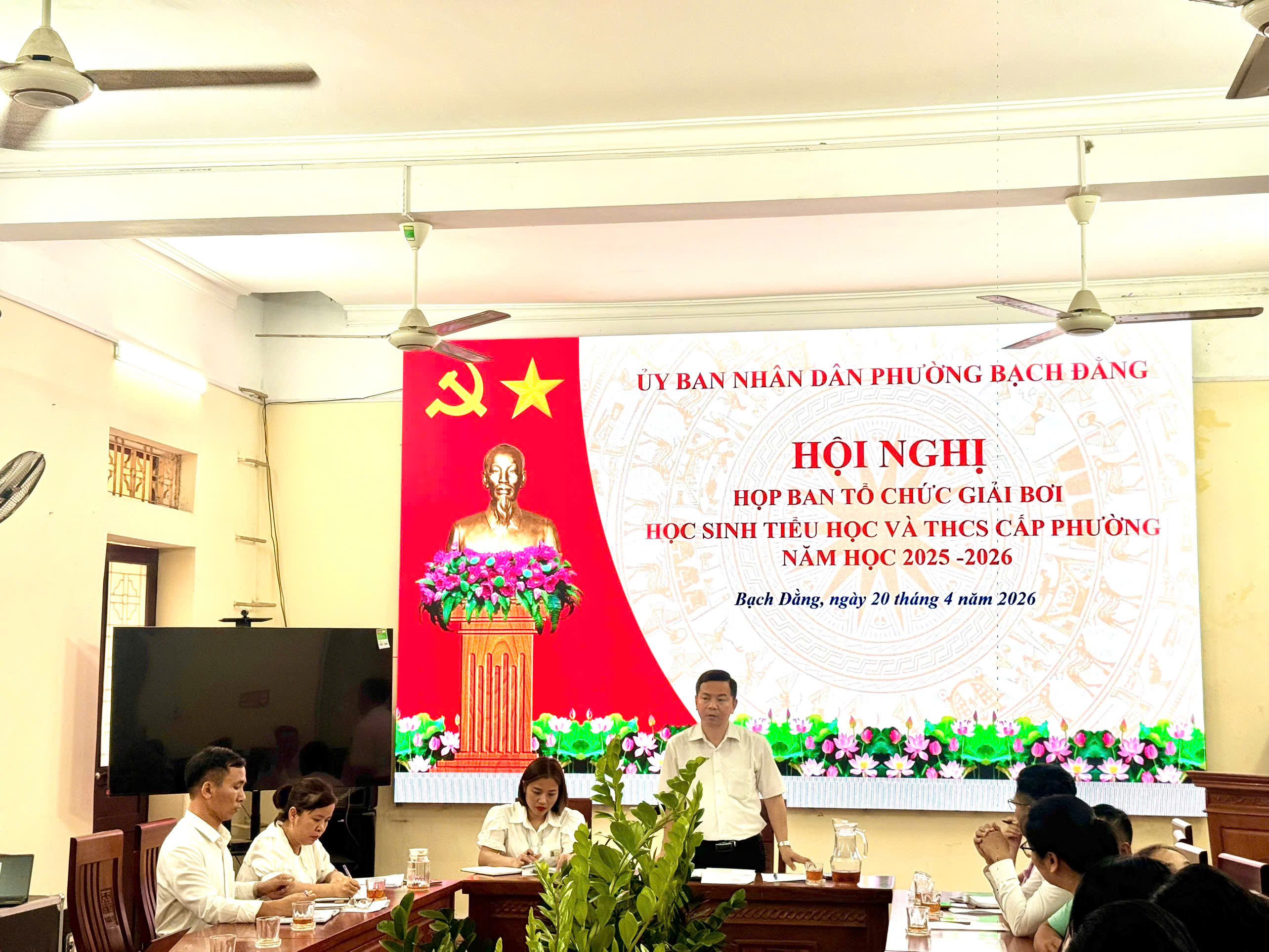 Chiều ngày 20/4/2026, UBND phường Bạch Đằng tổ chức Hội nghị họp Ban Tổ chức Giải bơi học sinh Tiểu học và Trung học cơ sở cấp phường năm học 2025 - 2026 nhằm triển khai các nhiệm vụ chuẩn bị tổ chức giải, bảo đảm giải đấu diễn ra nghiêm túc, an toàn và hiệu quả. Địa điểm tổ chức giải bơi: Bể bơi Lữ đoàn Đặc công Hải quân 126.