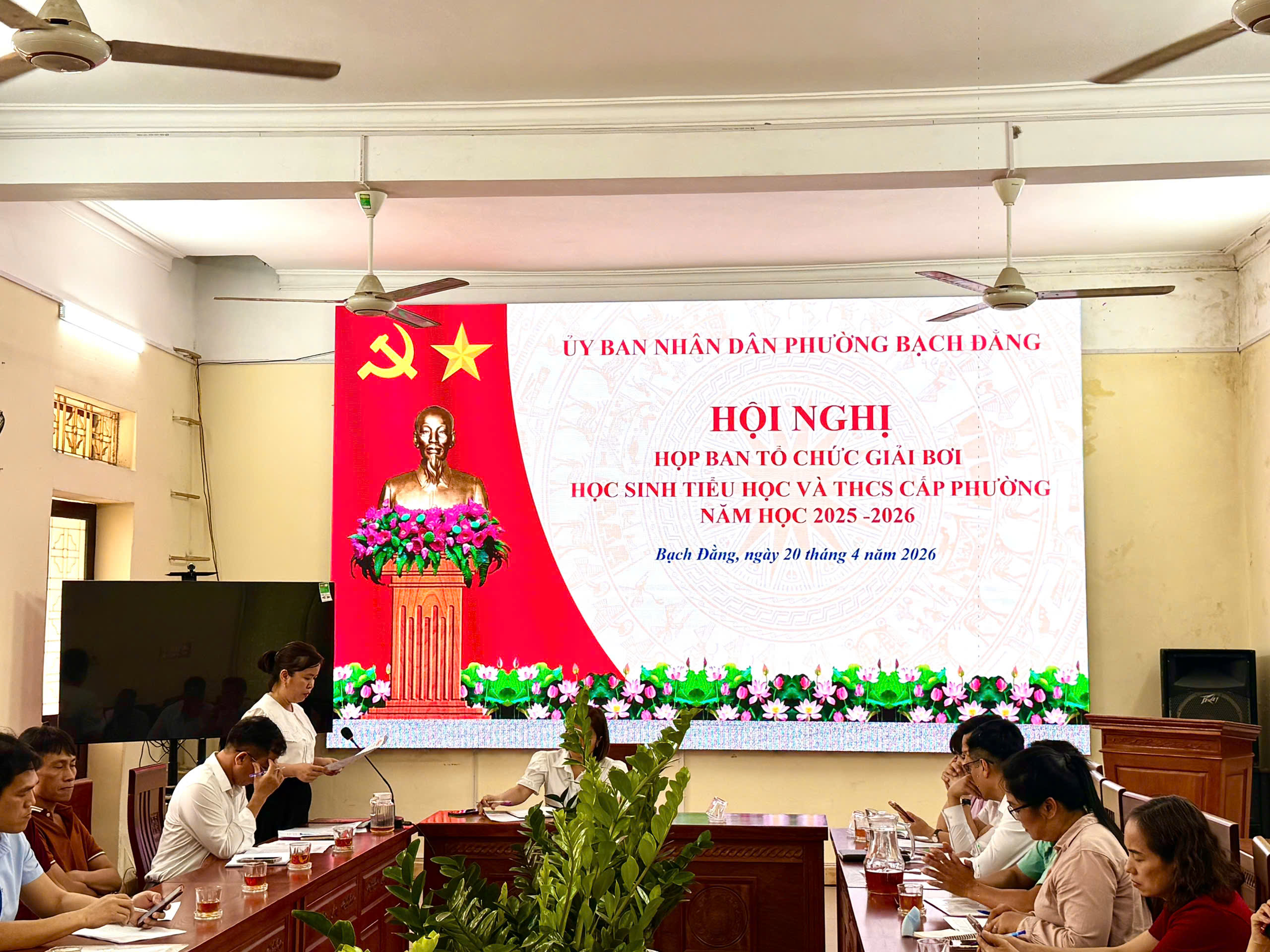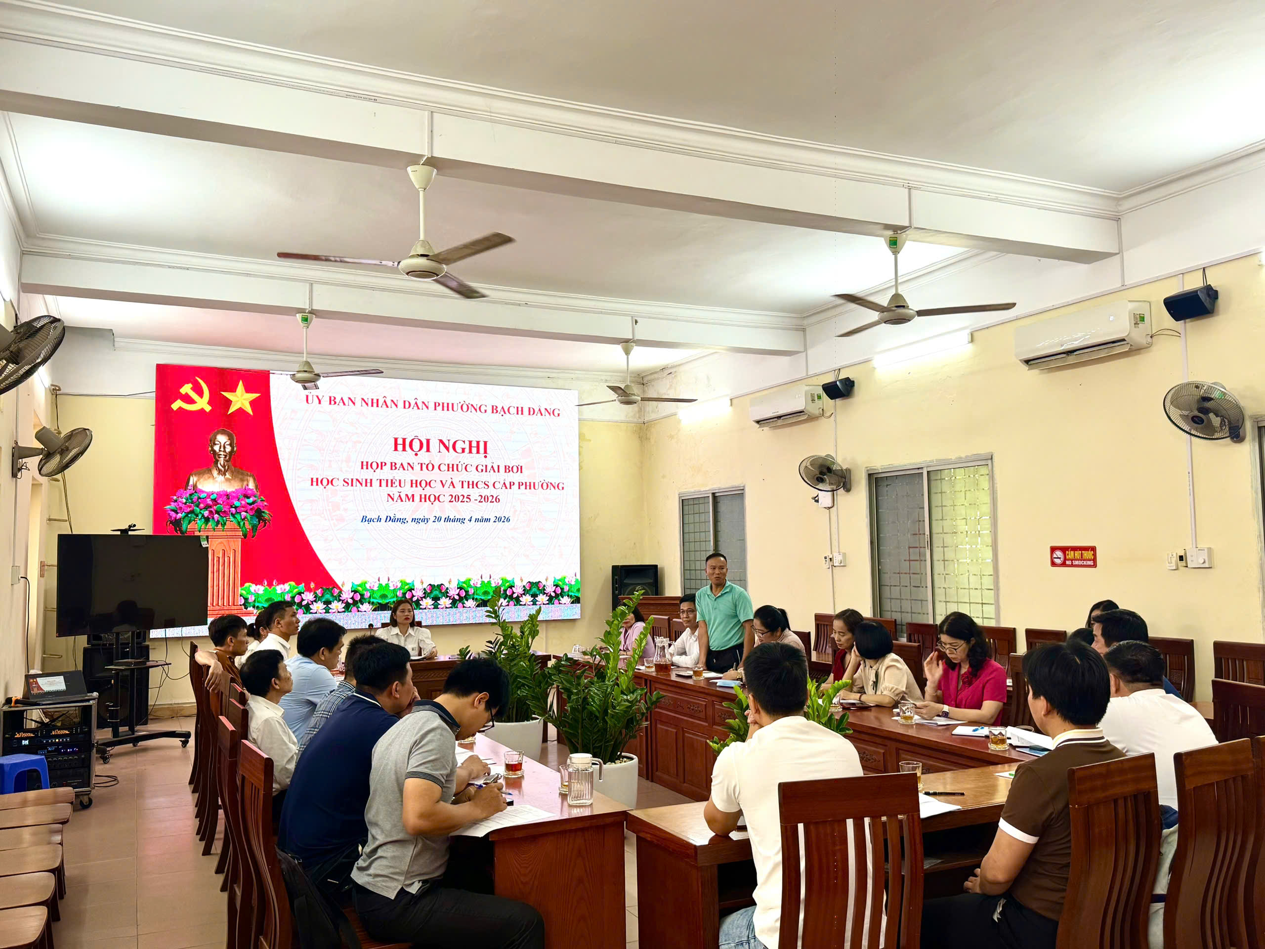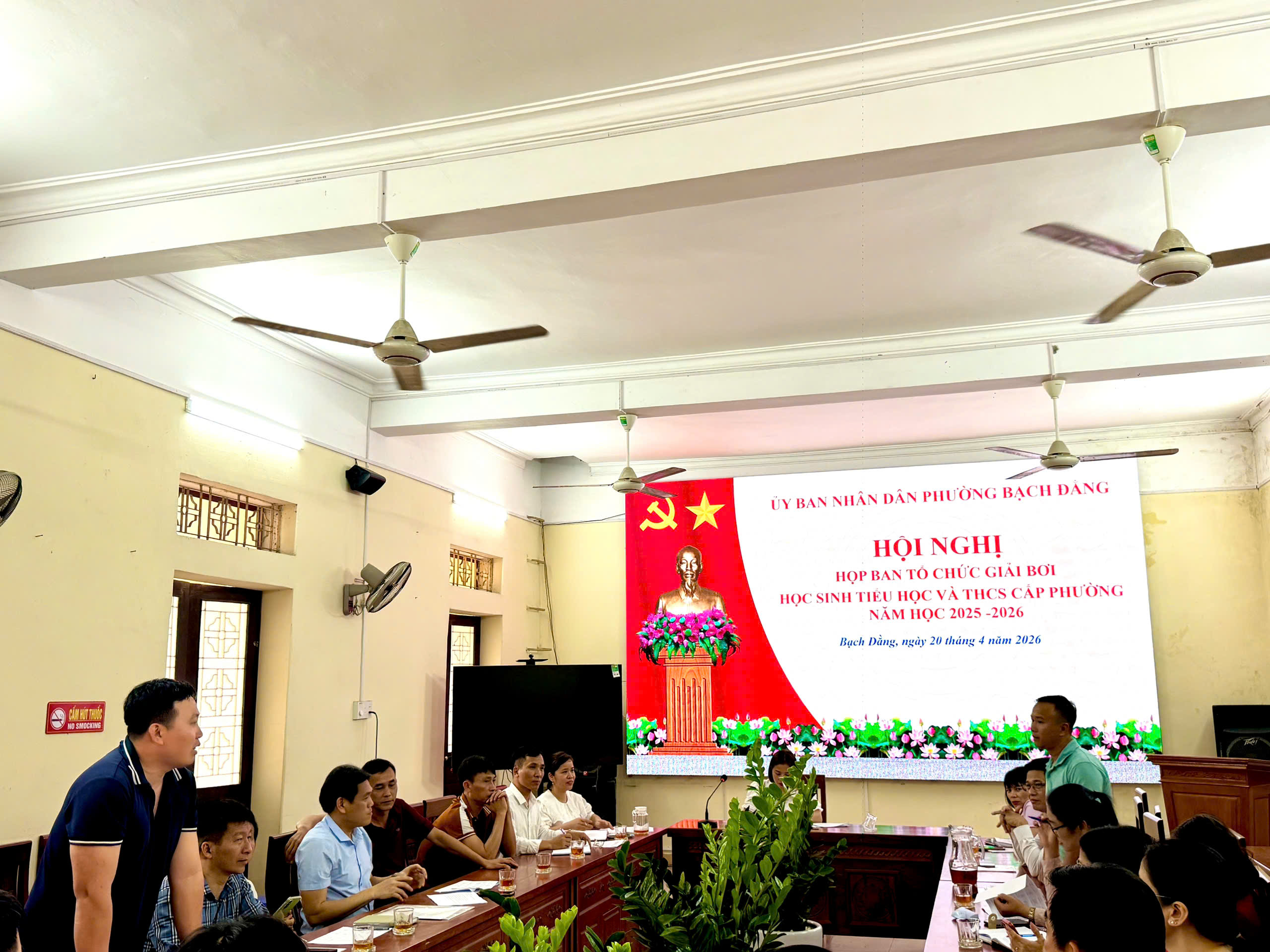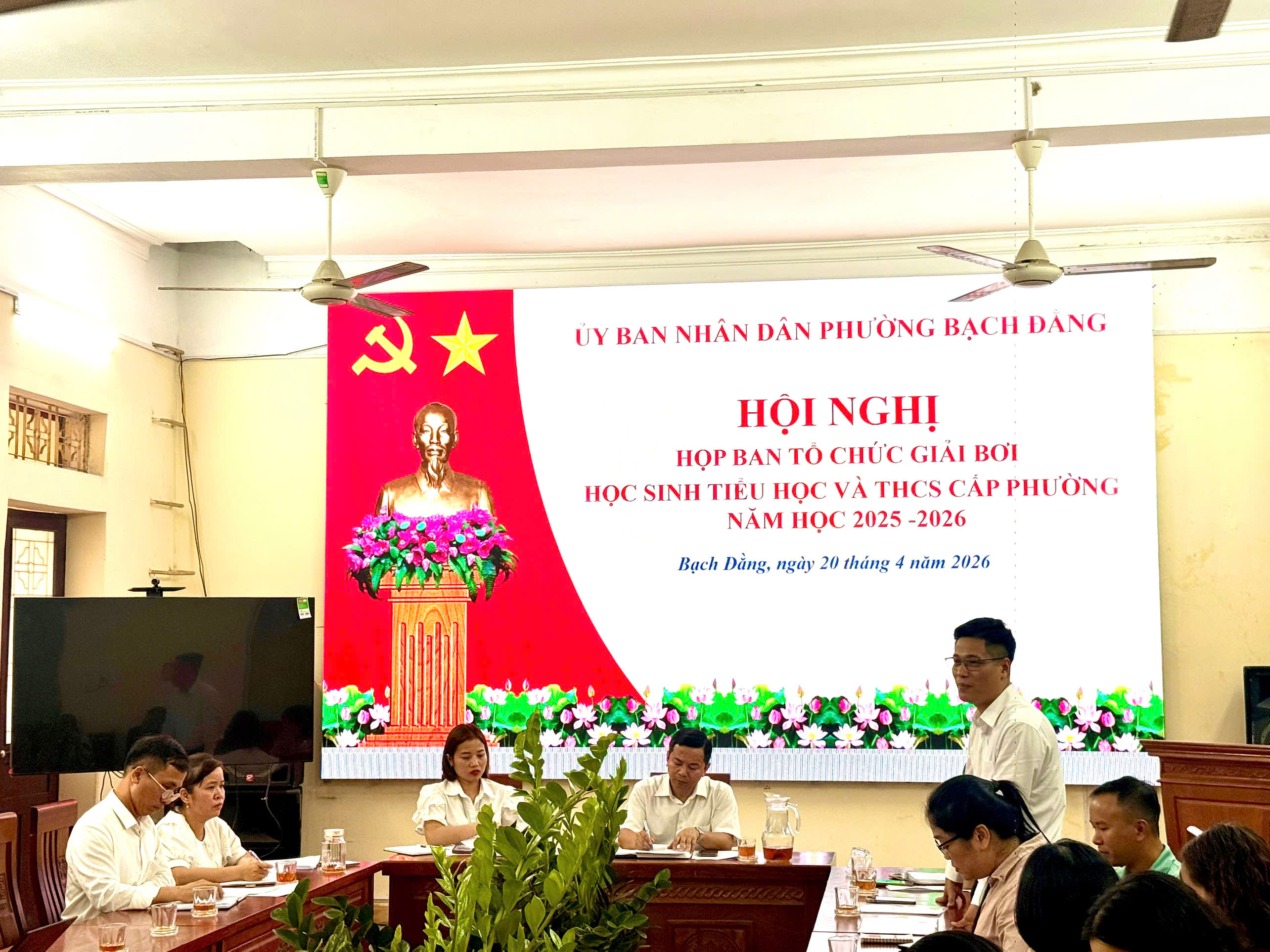 Chiều ngày 20/4/2026, UBND phường Bạch Đằng tổ chức Hội nghị họp Ban Tổ chức Giải bơi học sinh Tiểu học và Trung học cơ sở cấp phường năm học 2025 - 2026 nhằm triển khai các nhiệm vụ chuẩn bị tổ chức giải, bảo đảm giải đấu diễn ra nghiêm túc, an toàn và hiệu quả. Địa điểm tổ chức giải bơi: Bể bơi Lữ đoàn Đặc công Hải quân 126.